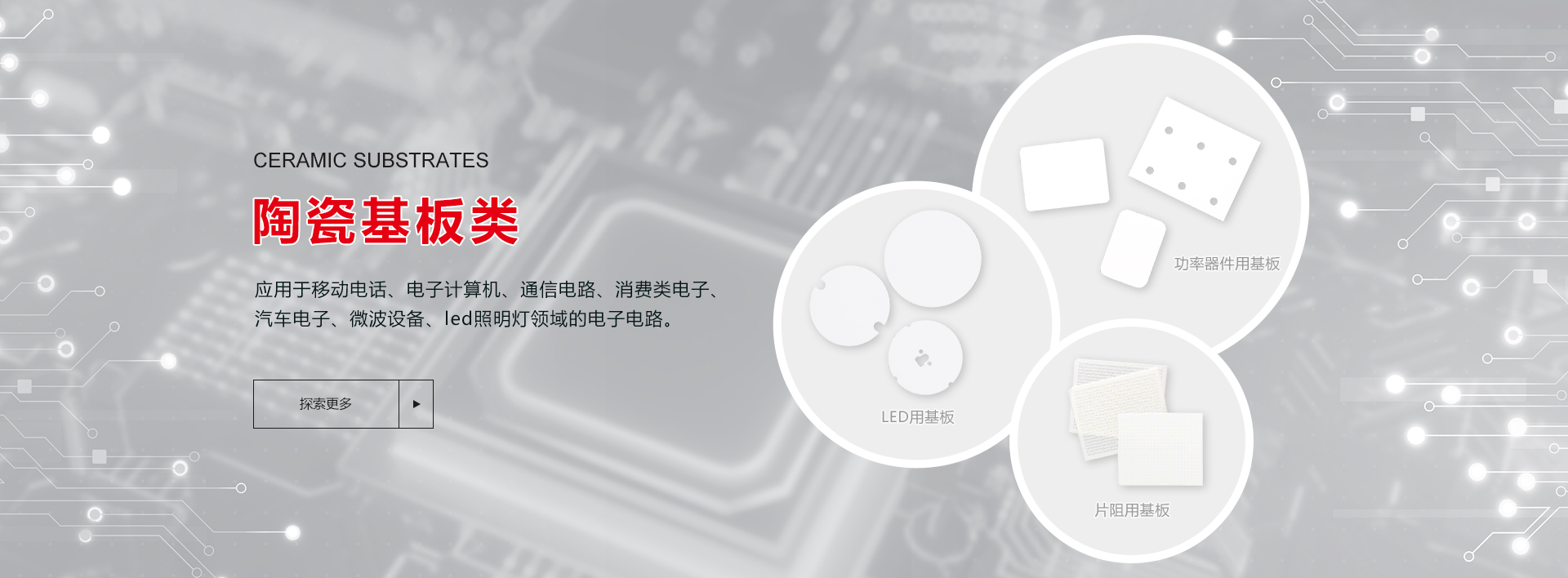片式電阻、厚膜混合集成電路、LED等氧化鋁陶瓷基體; 應用于移動電話、電子計算機、通信電路、消費類電子、汽車電子、 微波設備、LED照明等領域的電子電路。